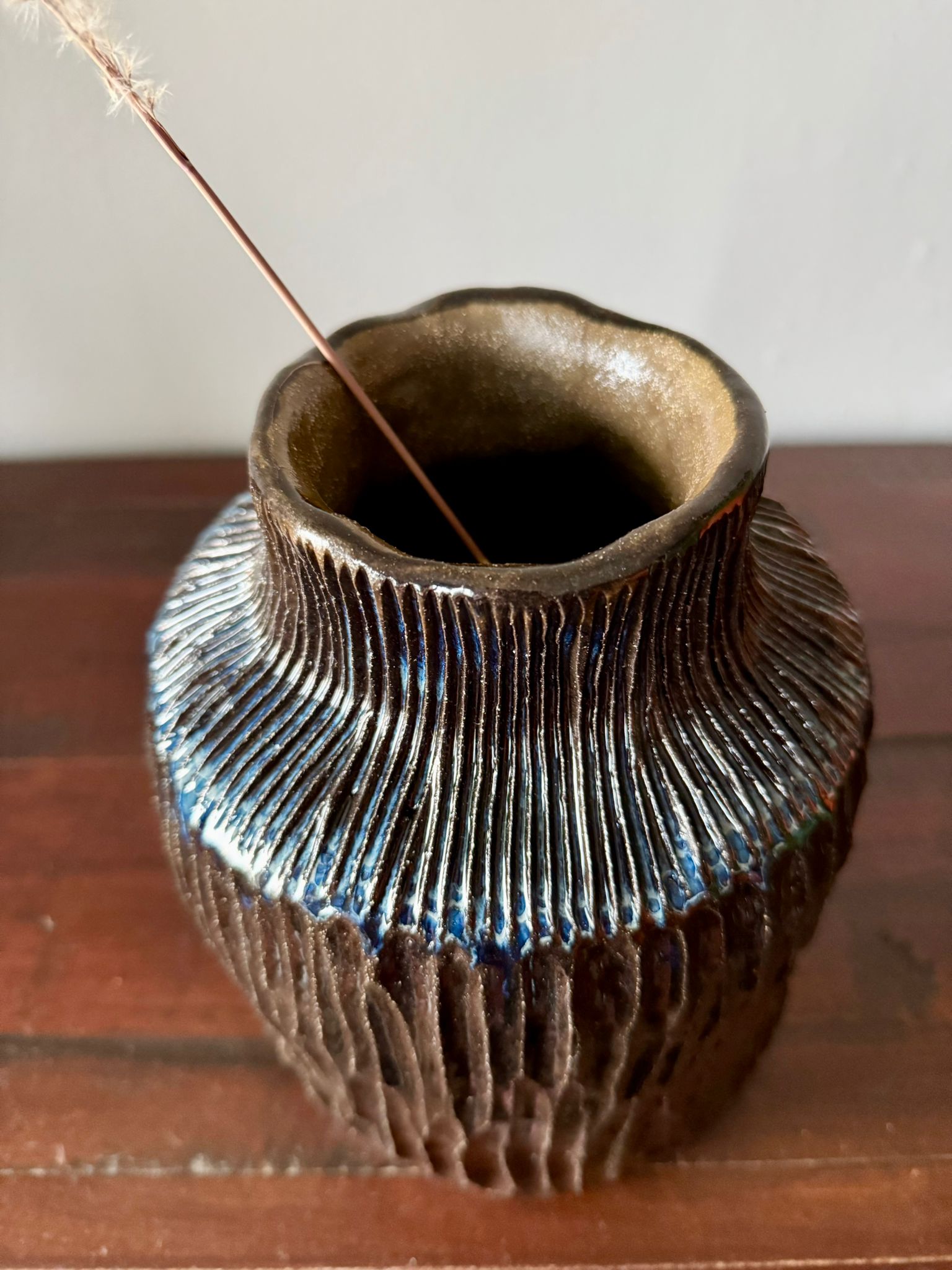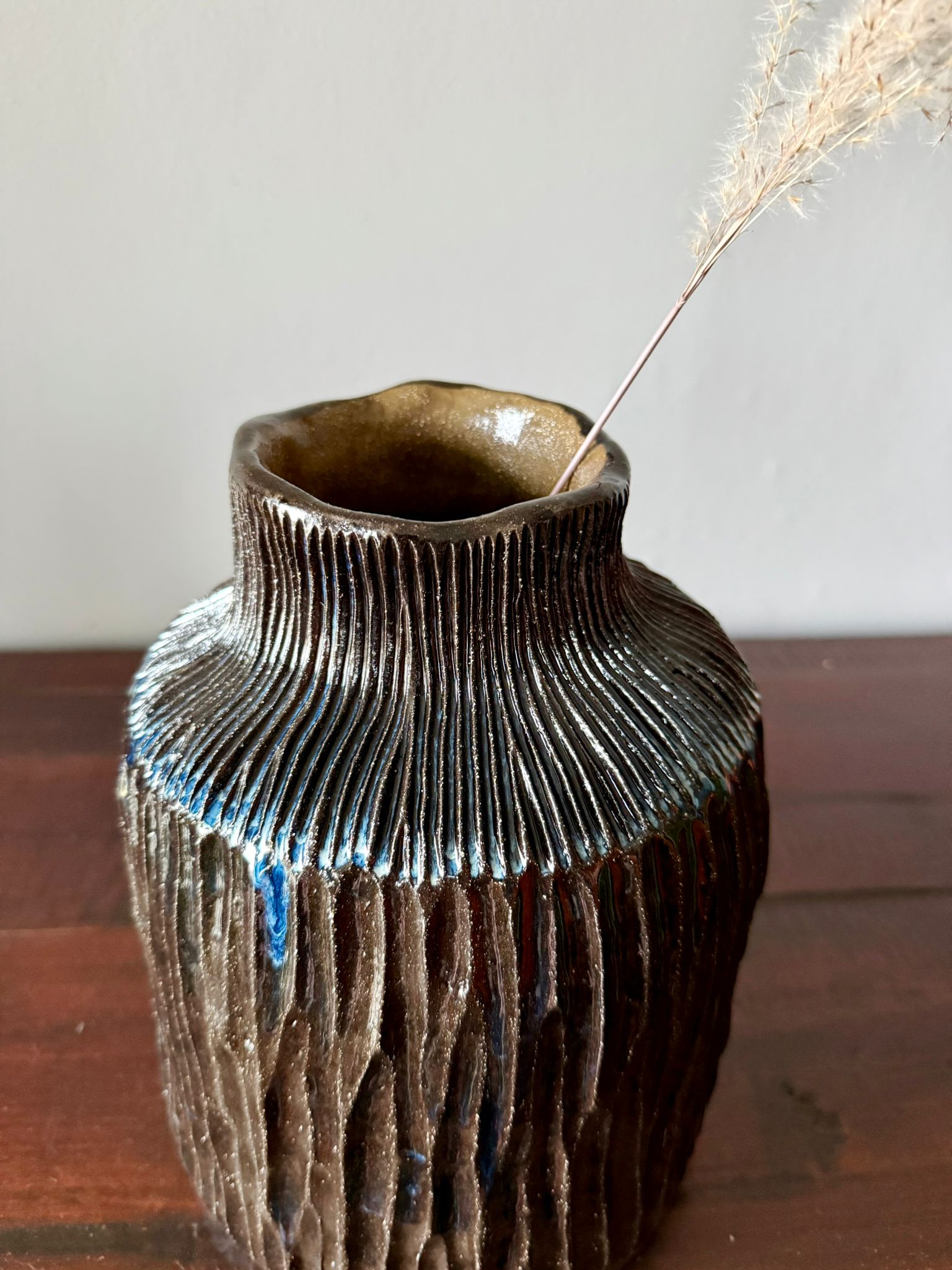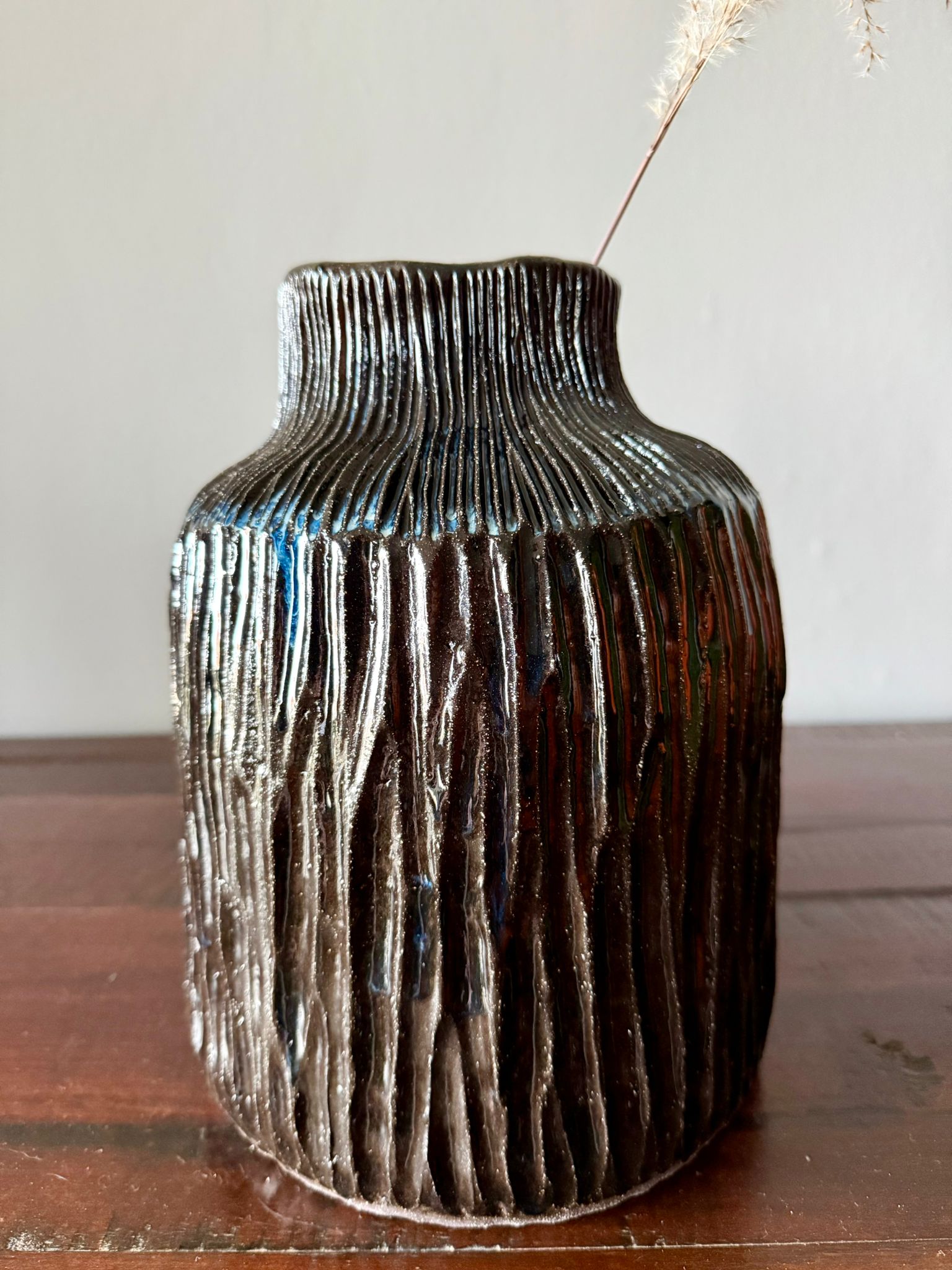 Duży, ręcznie wykonany wazon ceramiczny z kolekcji Deep Lines to połączenie surowej natury i artystycznej precyzji. Został wykonany z szarej gliny i pokryty czarnym, błyszczącym szkliwem z subtelnymi niebieskimi przebarwieniami, które nadają mu głębi i wyjątkowego charakteru. Każdy egzemplarz jest ręcznie rzeźbiony, dzięki czemu stanowi niepowtarzalne dzieło sztuki.