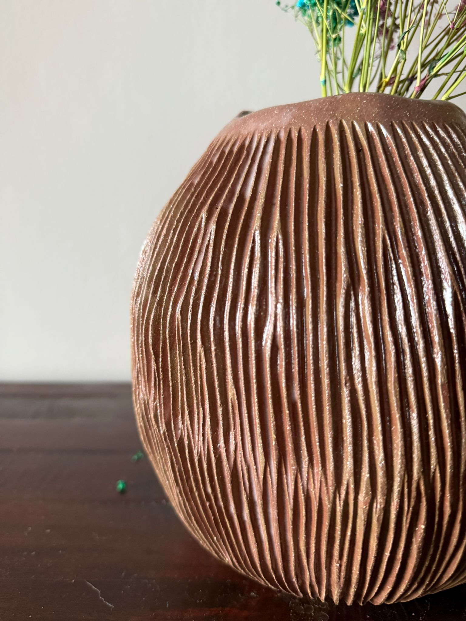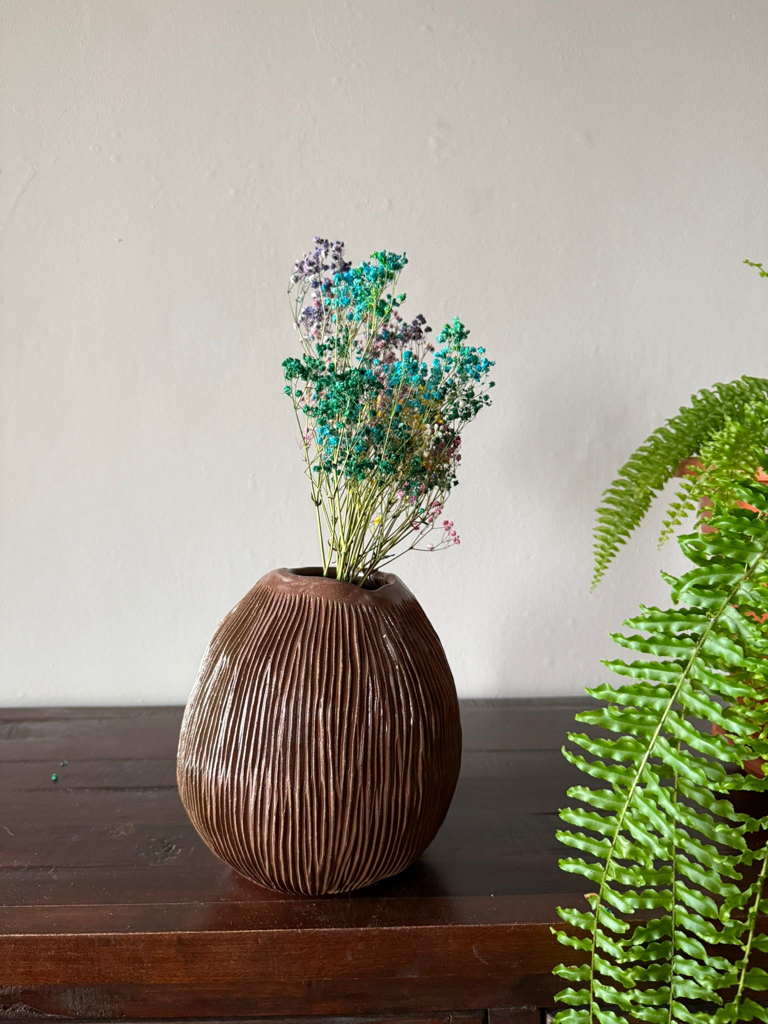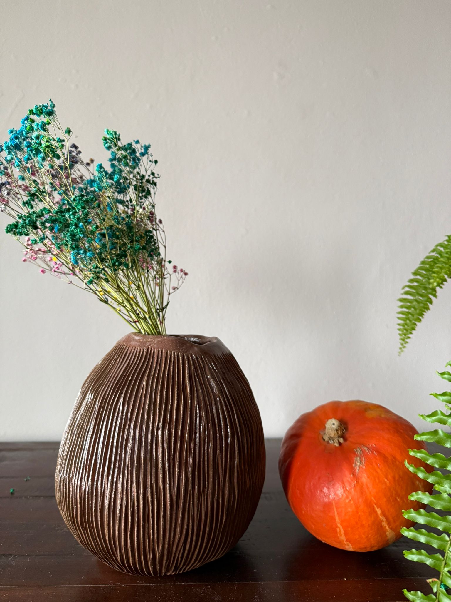 Wazon z kolekcji Deep Lines to wyjątkowy element dekoracyjny, łączący funkcjonalność z artystycznym wyrazem. Wykonany ręcznie z ceramiki w kolorze brązu, pokryty transparentnym szkliwem, zachwyca naturalną strukturą gliny i subtelnym połyskiem. Jego rzeźbiarska forma sprawia, że może pełnić rolę zarówno wazonu na kwiaty, jak i samodzielnej dekoracyjnej rzeźby, wprowadzając do wnętrza artystyczny akcent.
