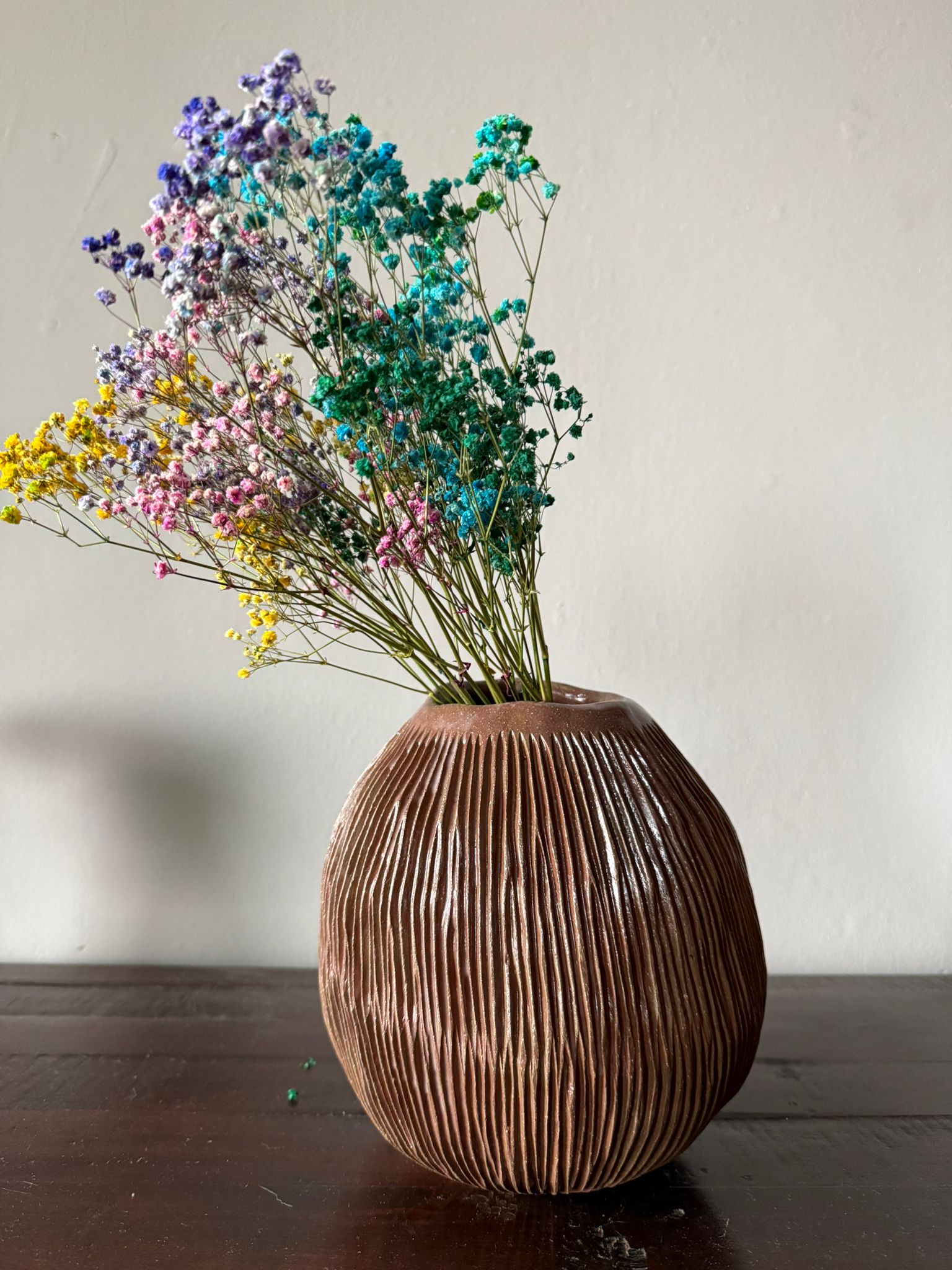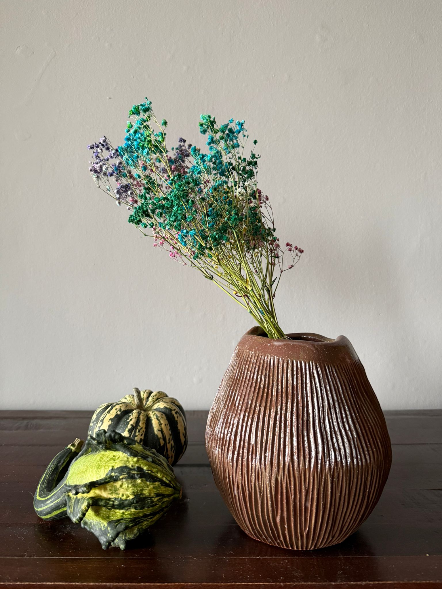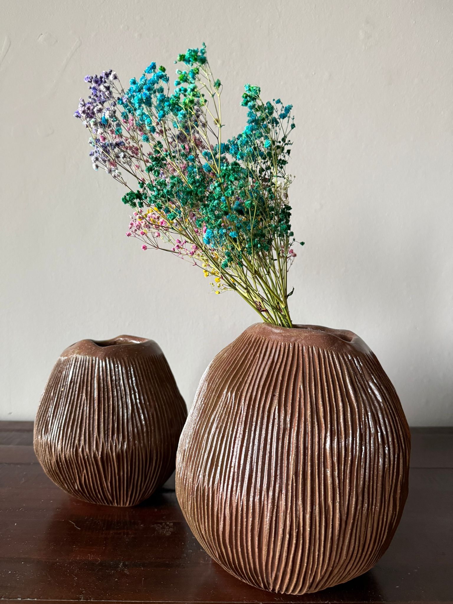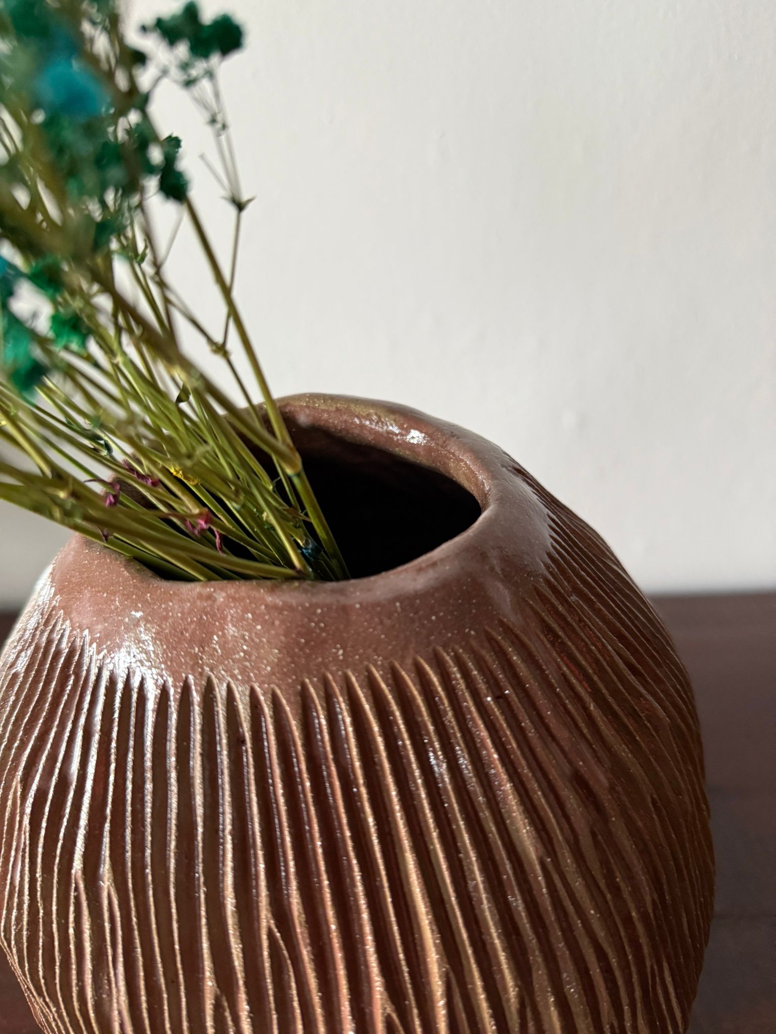 Wazon z kolekcji Deep Lines to wyjątkowy element dekoracyjny, łączący funkcjonalność z artystycznym wyrazem. Wykonany ręcznie z ceramiki w kolorze brązu, pokryty transparentnym szkliwem, zachwyca naturalną strukturą gliny i subtelnym połyskiem. Jego rzeźbiarska forma sprawia, że może pełnić rolę zarówno wazonu na kwiaty, jak i samodzielnej dekoracyjnej rzeźby, wprowadzając do wnętrza artystyczny akcent.