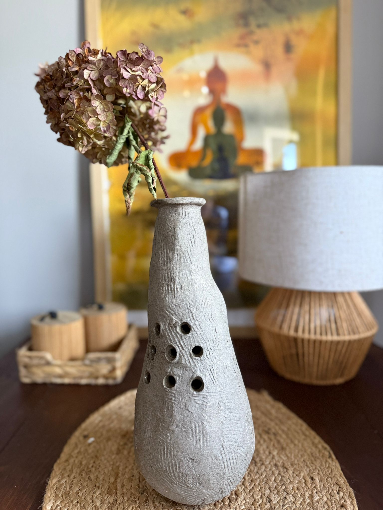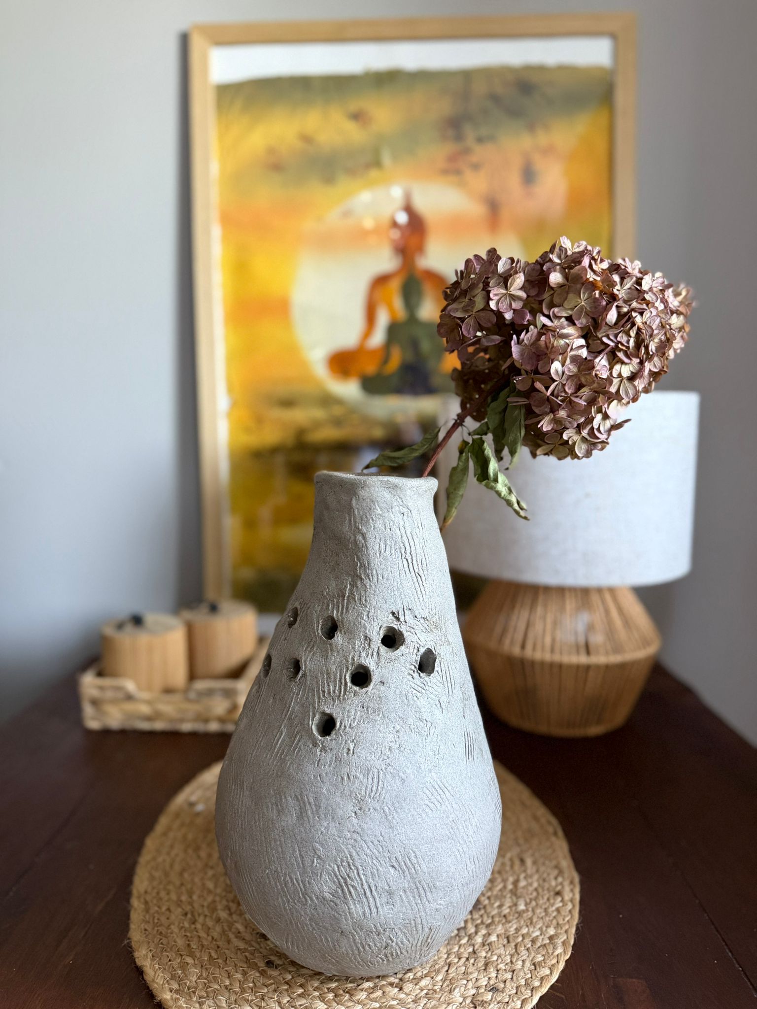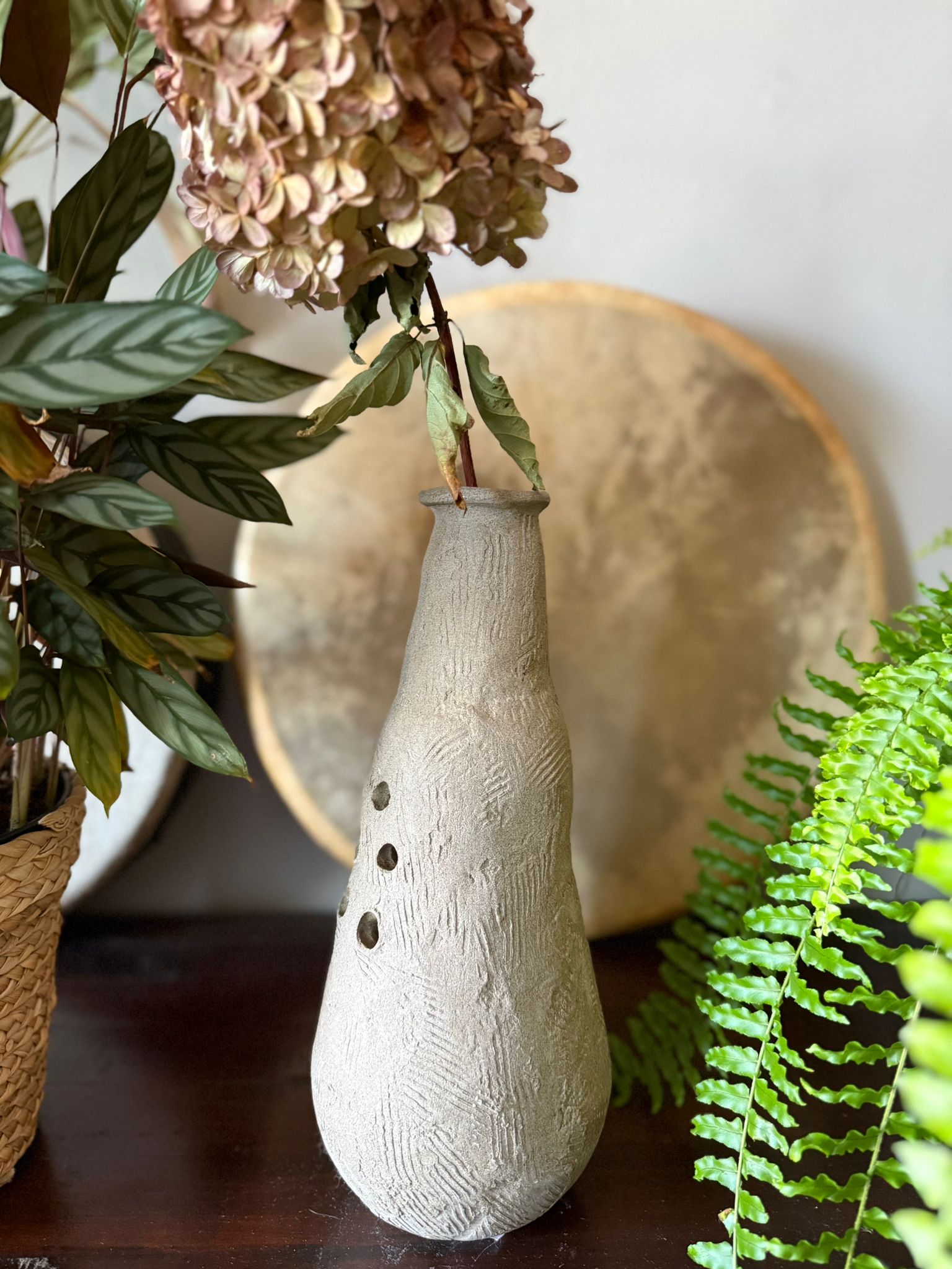 Nowoczesny i minimalistyczny wazon wykonany z szarej, betonowej gliny. Jego zewnętrzna powierzchnia pozostaje surowa i strukturalna, co podkreśla naturalne piękno materiału. Wnętrze zostało pokryte transparentnym szkliwem, dzięki czemu wazon jest nie tylko dekoracyjny, ale też w pełni funkcjonalny.