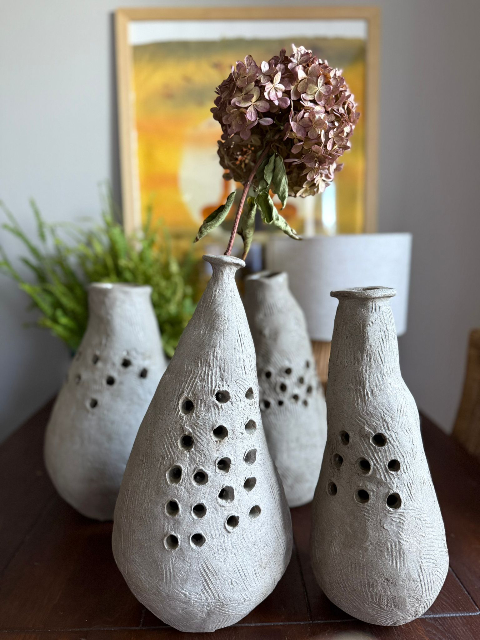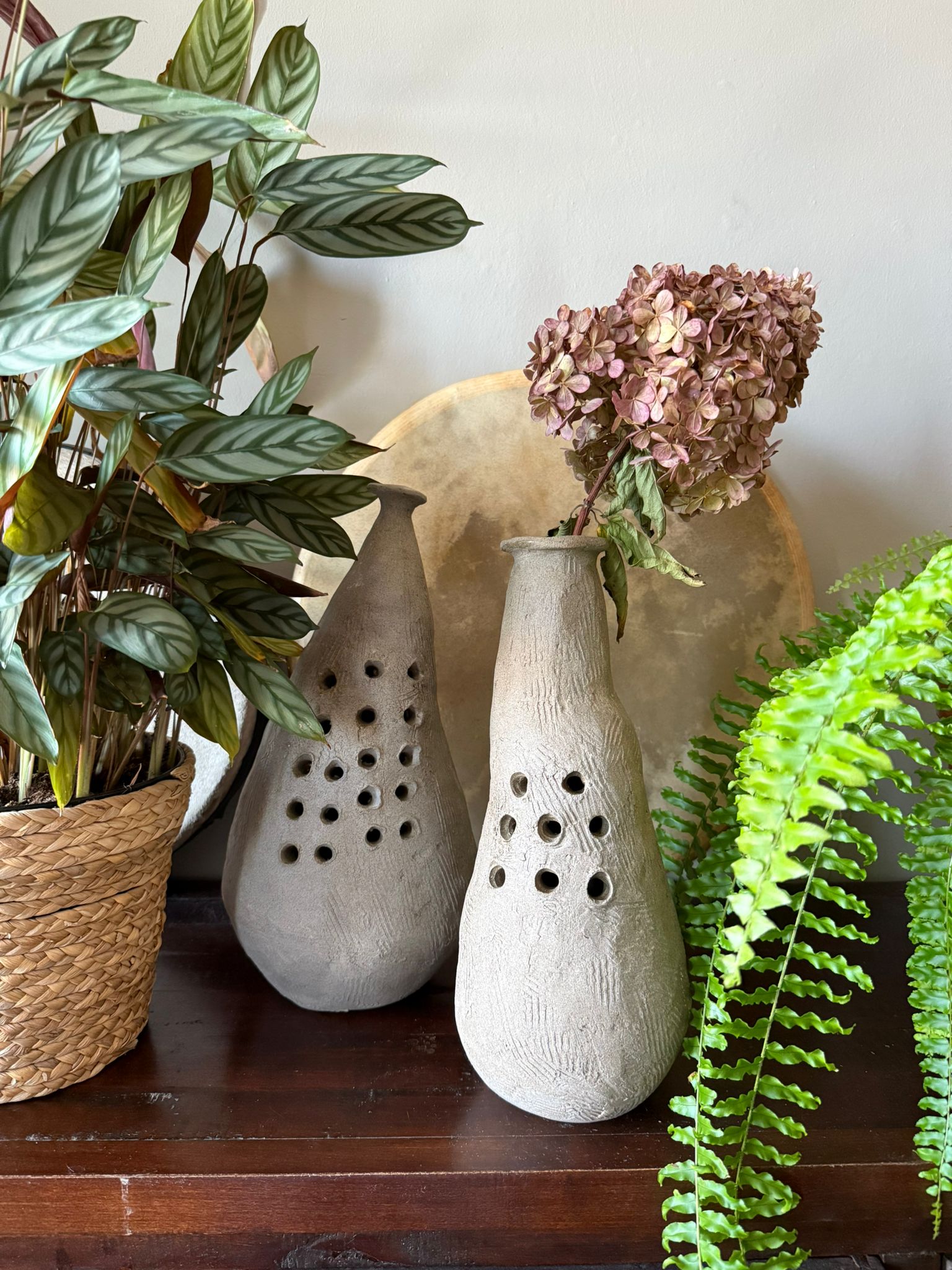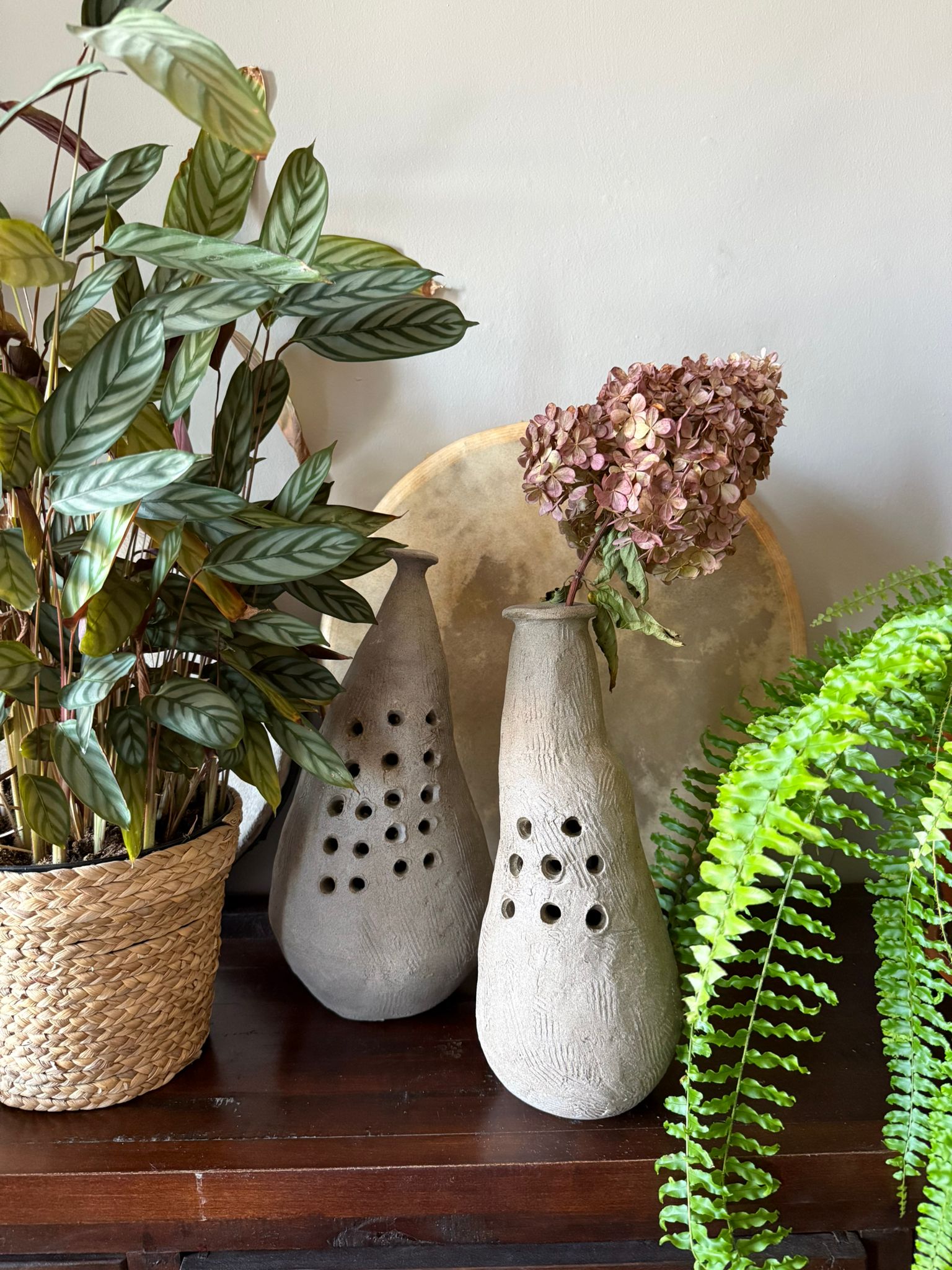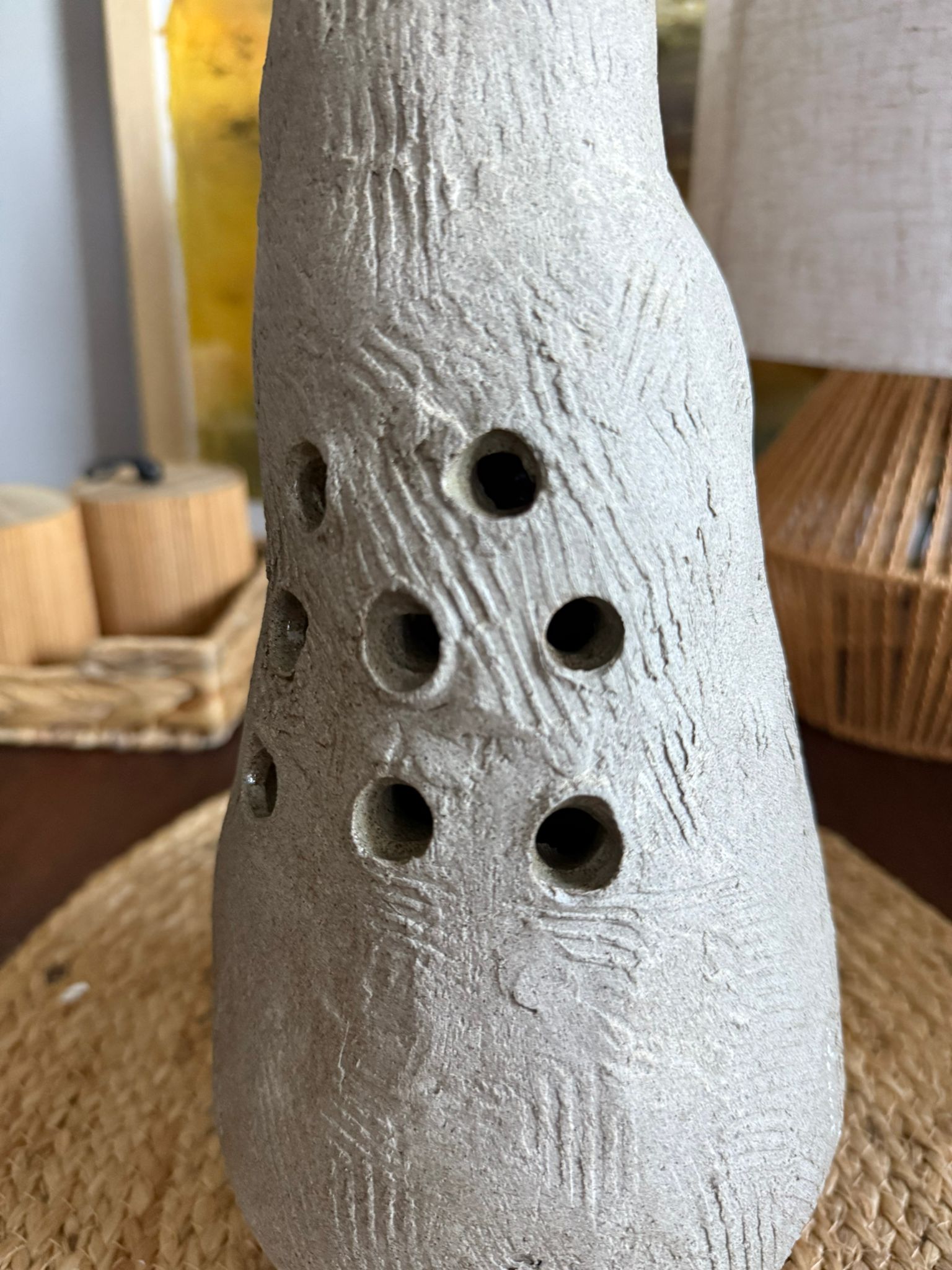Nowoczesny i minimalistyczny wazon wykonany z szarej, betonowej gliny. Jego zewnętrzna powierzchnia pozostaje surowa i strukturalna, co podkreśla naturalne piękno materiału. Wnętrze zostało pokryte transparentnym szkliwem, dzięki czemu wazon jest nie tylko dekoracyjny, ale też w pełni funkcjonalny.