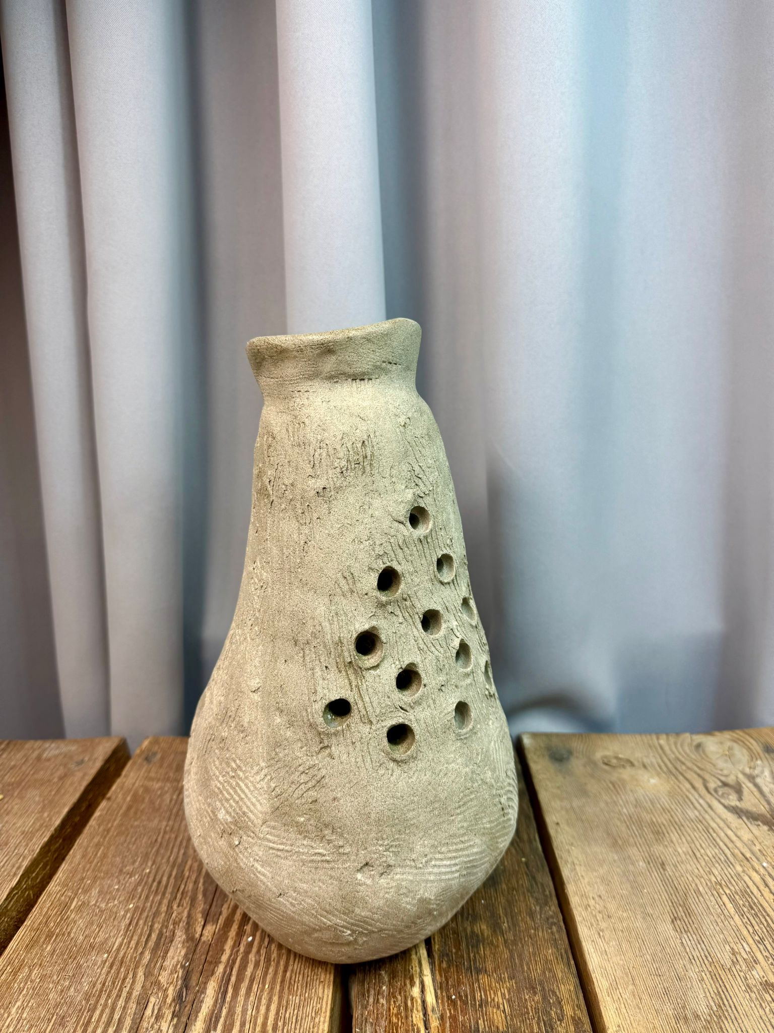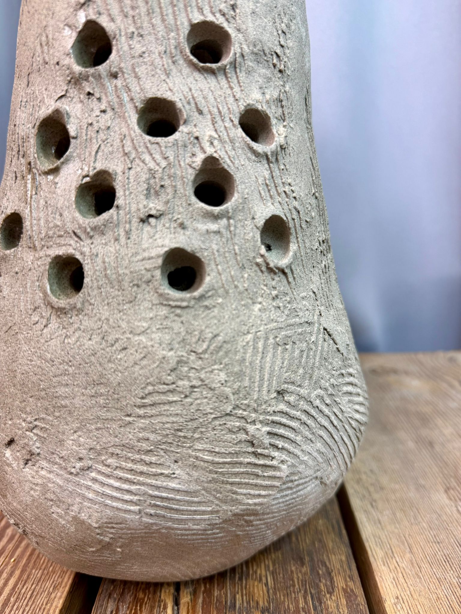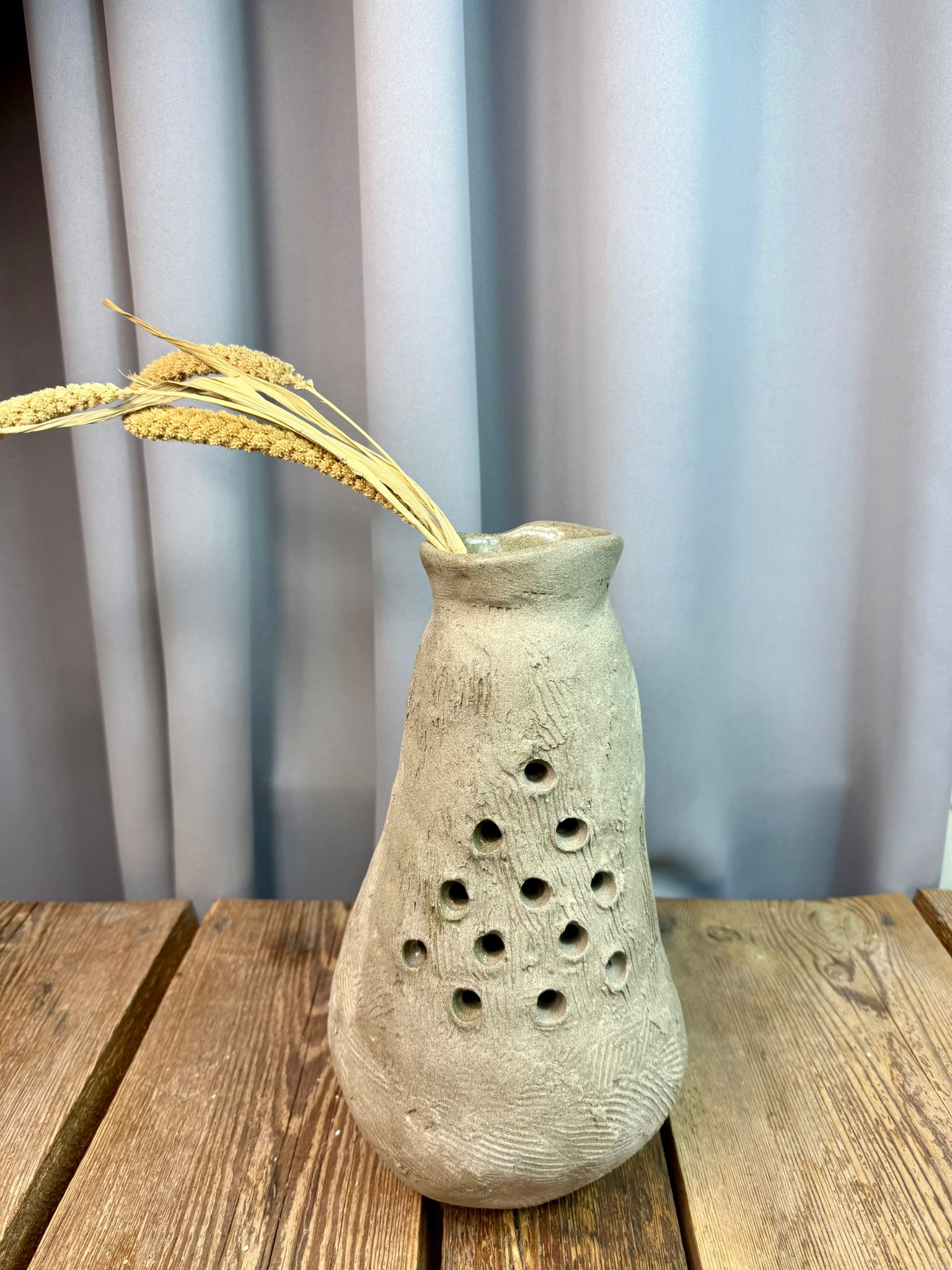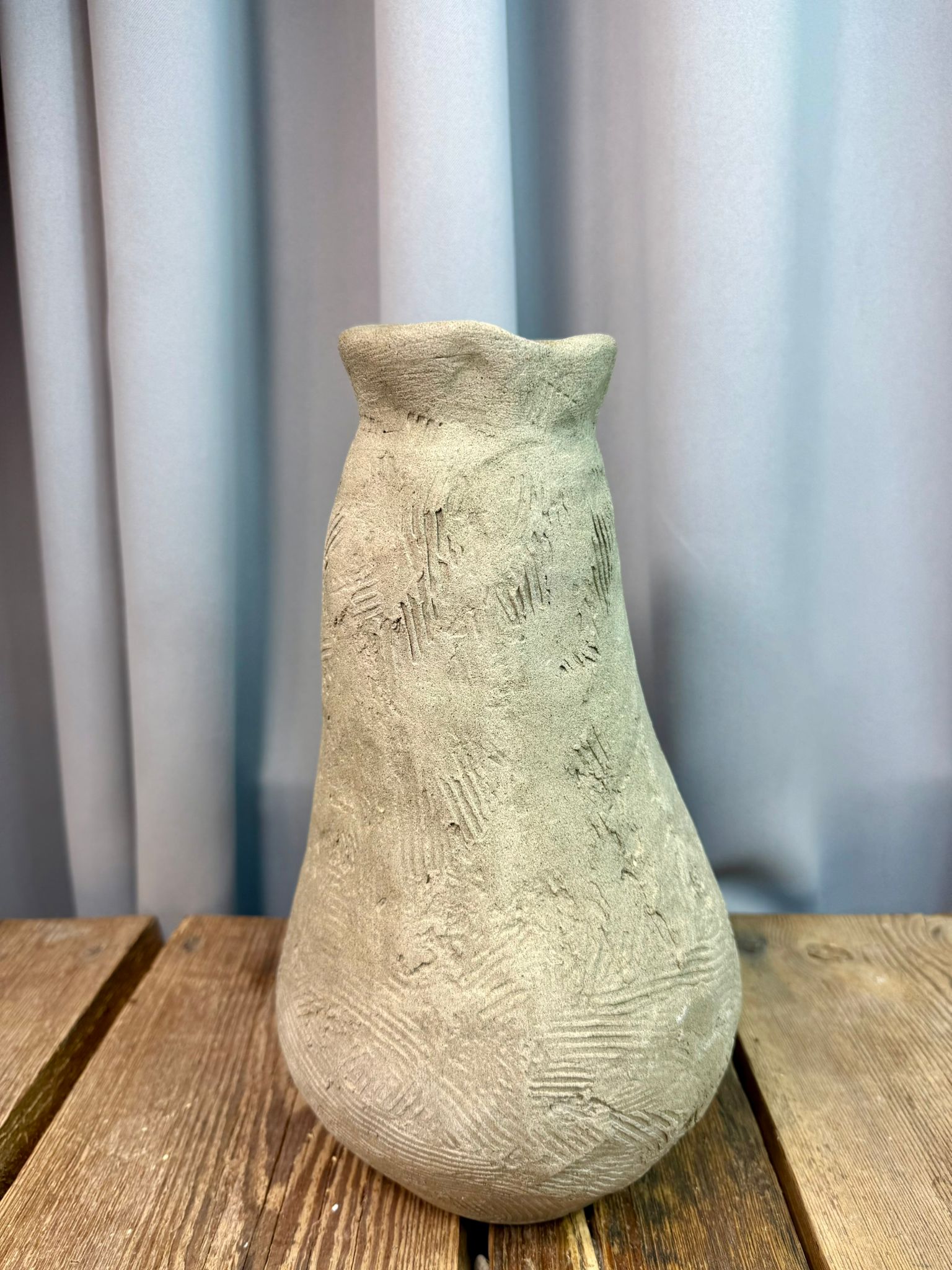 Minimalistyczny wazon wykonany z wysokiej jakości szarej, betonowej gliny. Jego powierzchnia zewnętrzna pozostaje surowa i strukturalna, co podkreśla naturalne piękno gliny. Wnętrze zostało pokryte transparentnym szkliwem, które nadaje subtelnego połysku i sprawia, że wazon jest w pełni użytkowy.